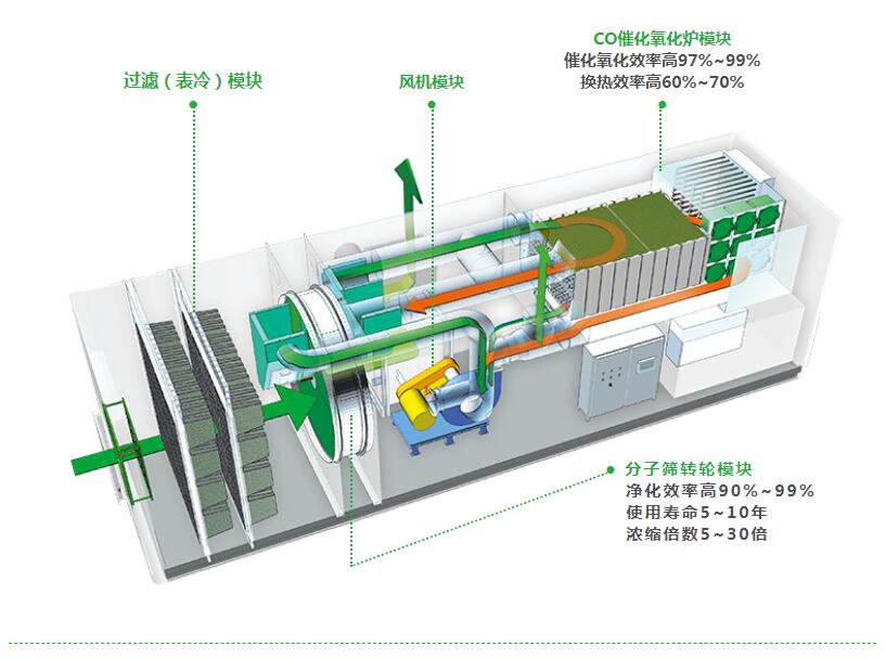 3.选用活性炭吸附或沸石分子筛作为预处理装置,通过吸附-脱附再生的方式,为沸石转轮RTO提供稳定、高浓度的工业废气。然后稀释成沸石转轮RTO进行处理。