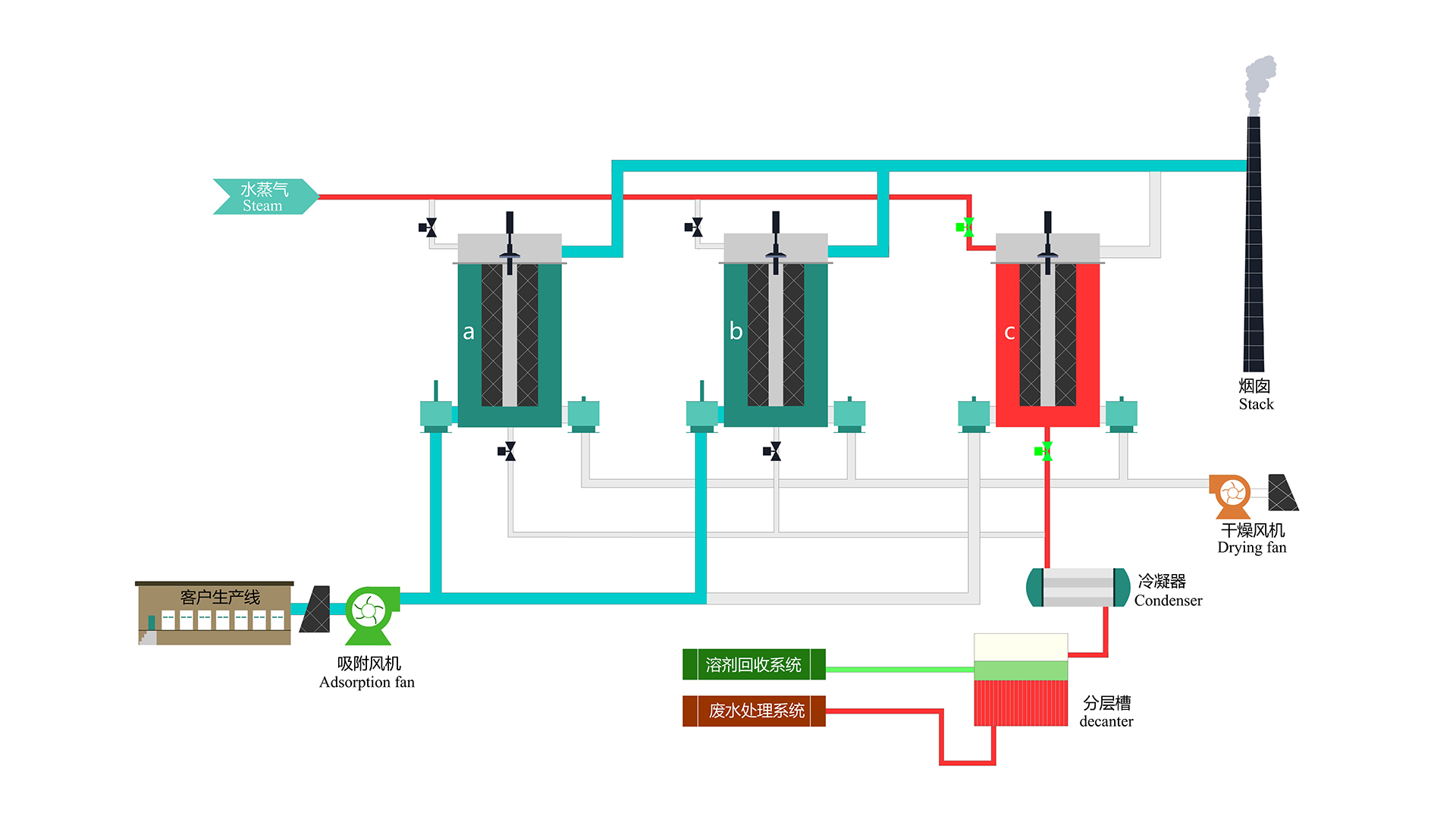 脱附过程:通过水蒸气将吸附材料表面的有机溶剂脱附处理,然后再进行冷凝回收。